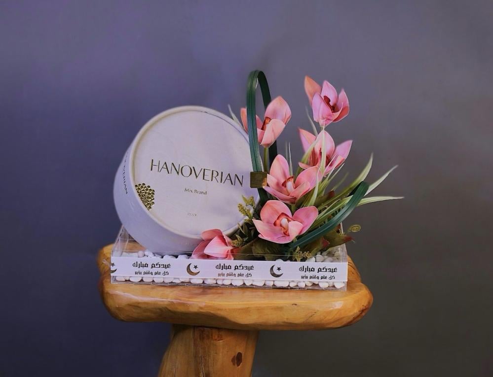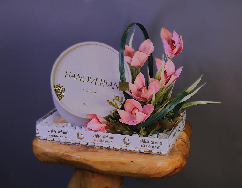 رفاهية تليق بمناسبات العيد… تنسيق أنيق يجمع بين الورد الصناعي الفاخر مع شوكليت هانوفريان المختار بعناية،
