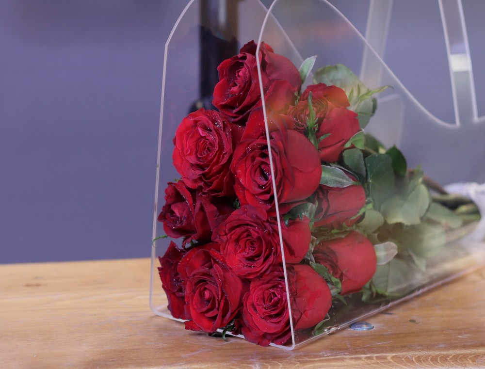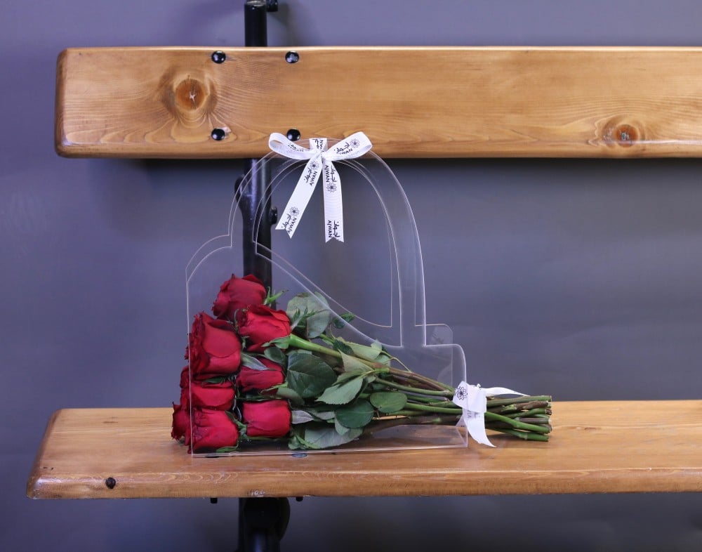 • تصميم ستاند شفاف: يتميز هذا التصميم بستاند شفاف على شكل حقيبة، مما يضيف لمسة من الابتكار والأناقة، ويسمح بعرض الزهور بشكل جميل.