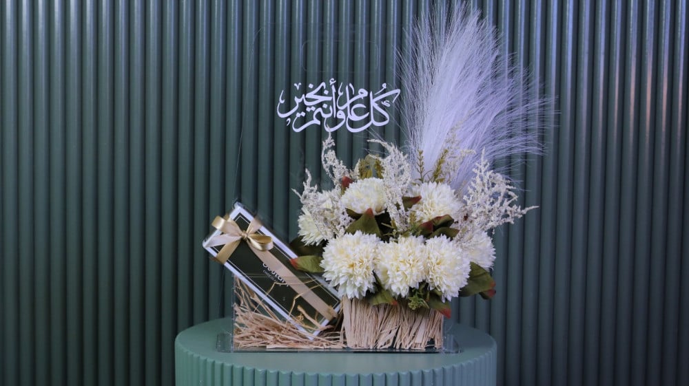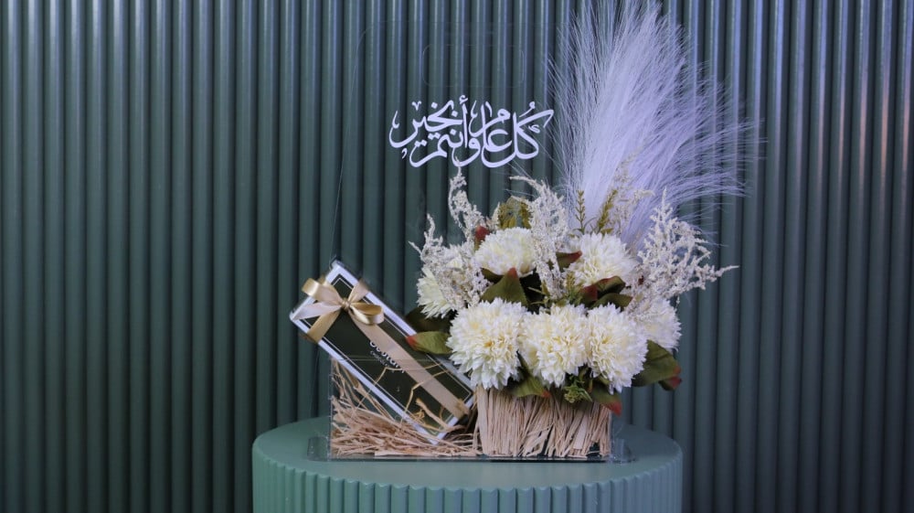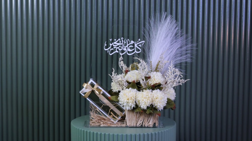 • عبارة "كل عام وأنتم بخير": مطبوعة بشكل جميل على الجزء العلوي لإضفاء لمسة احتفالية.