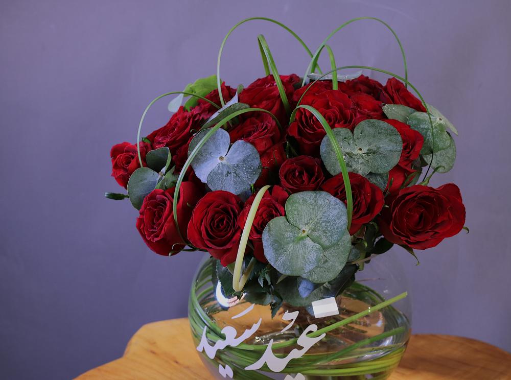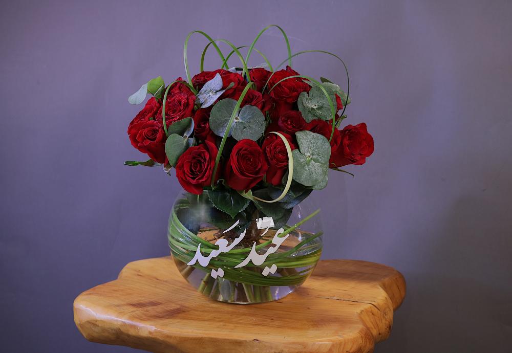 A transparent circular vase with an elegant and modern design, containing an elaborate arrangement of luxurious red roses with natural green leaves that add a touch of vitality and beauty. The vase is decorated with the phrase "Happy Eid" written in clear and elegant handwriting, to express an atmosphere of joy and celebration.