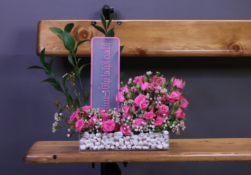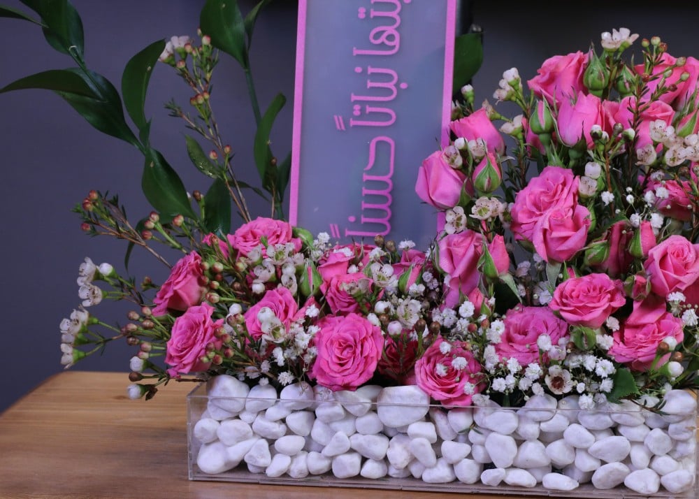 - Professional arrangement: The flowers were designed and arranged in an elegant acrylic stand containing white pebbles, to reflect luxury and attention to detail.